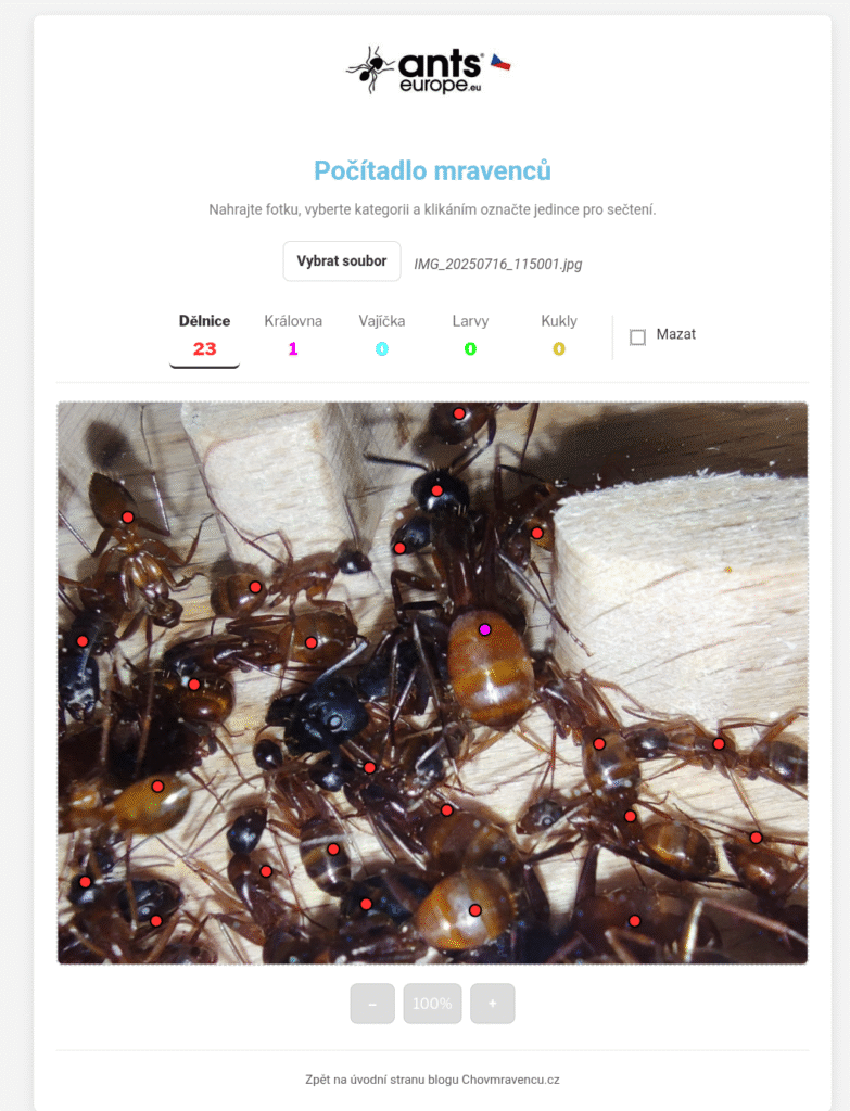 Už žádné zdlouhavé a chybné ruční počítání. Tahle aplikace je navržena tak, aby ti maximálně usnadnila monitorování tvojí kolonie. Jak to funguje? Stačí nahrát fotografii tvojí kolonie a poté manuálně označit tečkou každou dělnici, královnu, vajíčko, larvu či kuklu. Počítadlo za tebe automaticky sečte a všechny označené položky do přehledné tabulky.